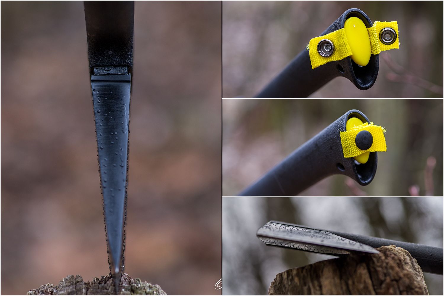 Рукоять топора чуть тоньше в охвате чем у Фискарса, грибок в конце рукояти чуть меньше (правда у ранних моделей Фискарса она была примерно такого же размера). Есть отверстие для темляка. Длина рукояти - около 35 см. В рукояти прячется 30-сантиметровая пила по дереву. Фиксируется в своем гнезде она стропой с кнопкой. В рукояти пилы есть отверстие для темляка. Сама пила выполняет роль вспомогательного инструмента. Возможно, вам понадобится где-то сделать аккуратный срез, который топор не может обеспечить. При рубке, в рукояти пила не издает посторонних звуков. К сожалению, пила не имеет развода зубьев: ширина пропила будет такой же ширины как полотно. Сами зубья - треугольной формы, без явно выраженного наклона (все равно в какую сторону прикладывать усилие). К сожалению, на моем экземпляре пилы есть некоторый брак - на части зубьев остался стальной заусенец от заточки, в таком виде пила плохо пилит и забивается стружкой. Исправить проблему при наличии алмазного надфиля не проблема.