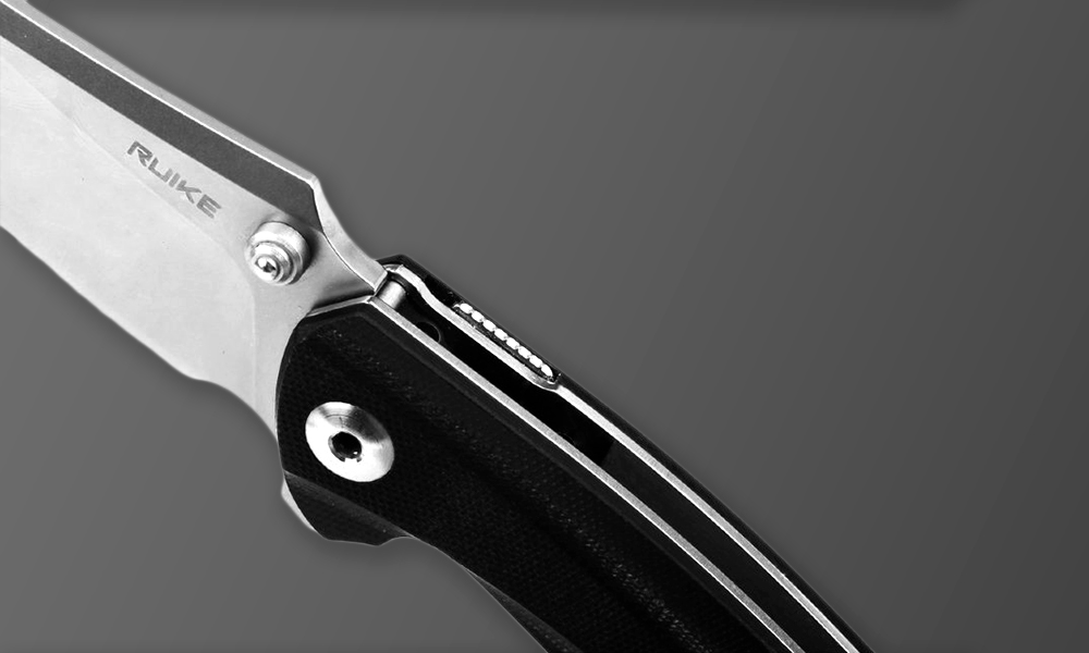 Рукоятка в модели Ruike P155 тоже не совсем обычная. Ее форма обеспечивает удобный и надежный хват, ведь ручка учитывает эргономику сжатой в кулак ладони. Закругленный край рукоятки не дает ножу выпасть из руки во время приложения больших усилий. Упор для указательного пальца обеспечивает край стальной пластины клинка, специально выступающий снизу. Рукоятка фиксируется двумя крупными болтами: по одному с каждой стороны. Кстати, осевой болт предусматривает использование подшипников, которые делают доставание клинка из рукоятки особенно плавным и легким.