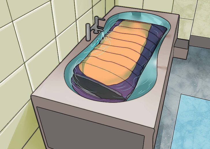 В домашних условиях лучшая ёмкость для стирки – это ванна. Её нужно наполнить тёплой, но не горячей водой, примерно на четверть, добавить моющее средства. Количество часто указывается в инструкции к нему (от 25 до 100 мл). Спальный мешок погружается в воду так, чтобы оболочка и наполнитель были полностью пропитаны водой. В таком виде его стоит оставить на 15-20 минут. Стирка выполняется при помощи мягкой губки. После проведения всех операций, воду следует выпустить из ванны. Полоскание выполняется похожим образом – наполнением и спуском холодной воды из ванны и переворачиванием мешка. Выжимание следует выполнять лёгким сдавливанием, чтобы убрать основную часть воды. Выкручивать его нельзя ни в коем случае.
