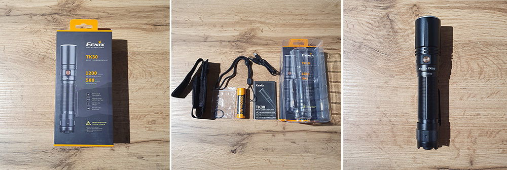 В комплекте предусмотрены: фонарь Fenix TK30L, батарея ARB-L21-5000U, кабель для зарядки USB Type-C, чехол с регулировкой длины, ремешок на руку, запасное уплотнительное кольцо, изоляционная пластинка, вкладыш для заметок, инструкция к применению, талон гарантии.