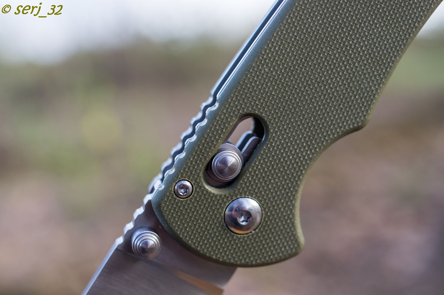На передней части рукоятки, которая переходит в обух, расположена упорная насечка для большого пальца. Шпенек на клинке двухсторонний, так что нож спокойно можно открывать как левой, так и правой рукой.