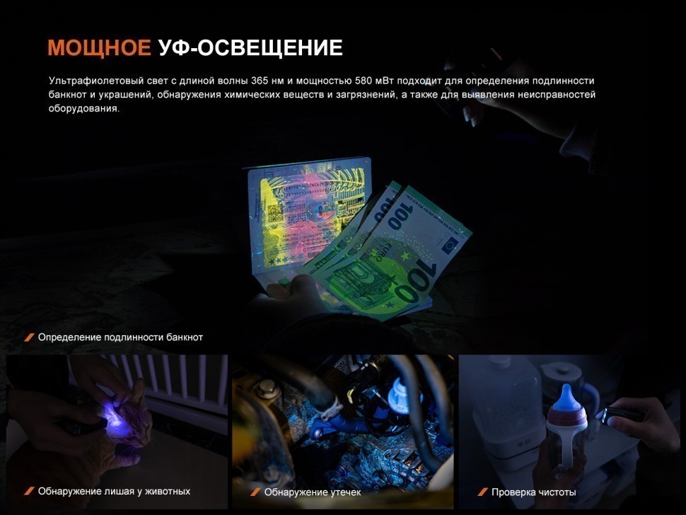 Универсальные фонарь-брелок Fenix E06R разработан для тех, кто ценит компактность и функциональность. Карманный фонарь EDC отлично подходит для повседневного использования, подачи сигналов, может использоваться в качестве указки. Оснащен четырьмя независимыми источниками света — белым и RGB-освещением, ультрафиолетовым излучением и красным лазером. Ультрафиолетовое освещение подходит для проверки подлинности документов, ювелирных изделий и банкнот, лазерная указка будет полезна для работы и учебы, а также пригодится для игр с домашними питомцами.
