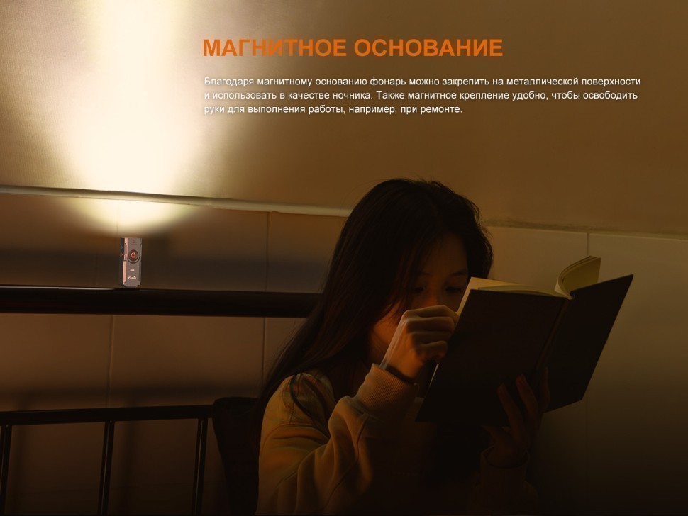 Магнитное основание фонаря позволяет использовать его без помощи рук, фиксируя на металлических поверхностях. Фонарь работает от встроенного аккумулятора мощностью 750 мАч. Время зарядки через порт USB Type-C составляет около 2 часов.