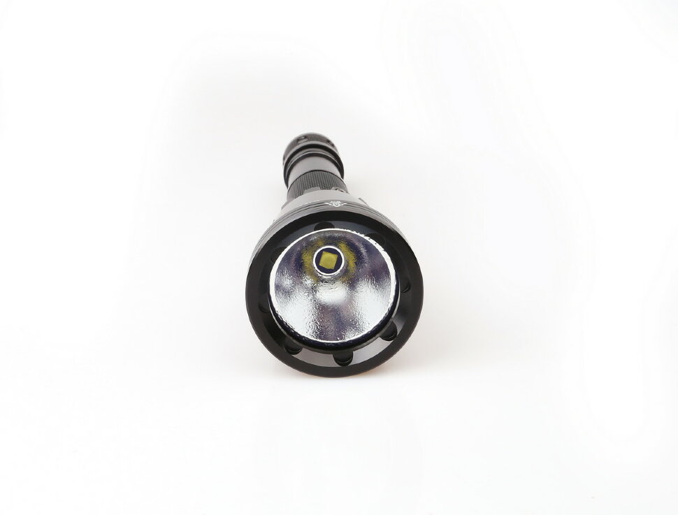 Корпус фонаря сделан из авиационного алюминия с Premium анодированием III степени. Он абсолютно надежно защищает внутренние механизмы устройства от механических повреждений и попадания воды вплоть до глубины 150 м. А для простоты управления во время погружений, предусмотрена возможность переключать режимы яркости при помощи поворотного механизма.