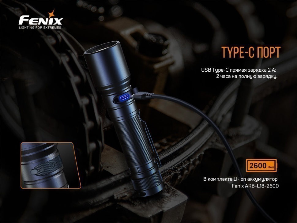 Комплектация: модель фонаря Fenix C6V3.0, ARB-L18-2600 Li-ion аккумулятор, USB Type-C кабель зарядки, ремешок на руку, уплотнительное кольцо, руководство пользователя, карточка гарантии.