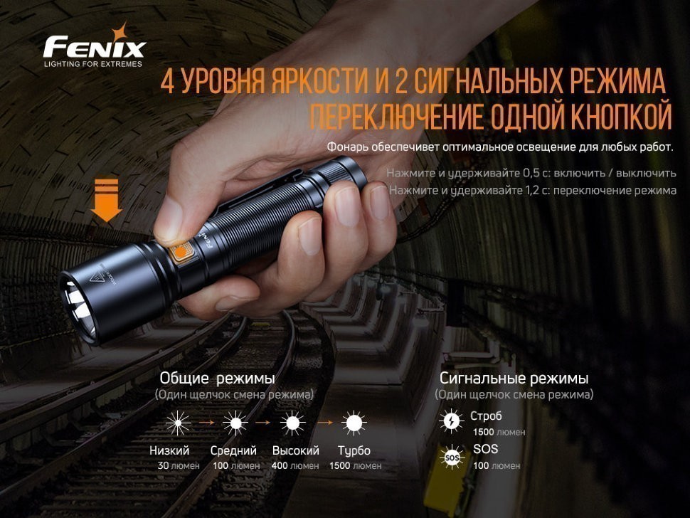 Строб: из выключенного состояния удерживайте переключатель 1,2 секунды. Фонарь запомнит последний задействованный уровень яркости в общей линейке режимов. При повторном включении будет запущен этот ранее применённый уровень. При выключении в каком-то из режимов вспышки фонарь активируется в режиме строба.