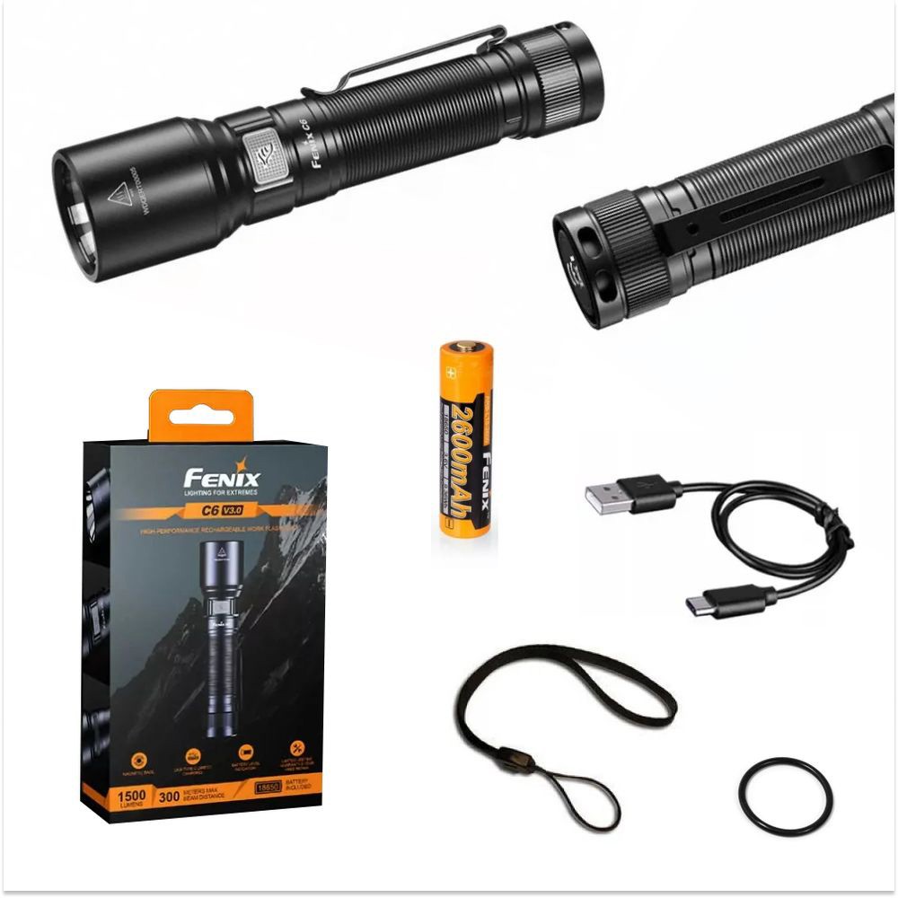 Комплектация: модель фонаря Fenix C6V3.0, ARB-L18-2600 Li-ion аккумулятор, USB Type-C кабель зарядки, ремешок на руку, уплотнительное кольцо, руководство пользователя, карточка гарантии.