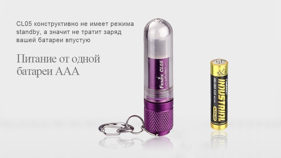 Инструкции по использованию: Фонарь-брелок CL05 работает от одного элемента питания размера ААА. Производители допускают использование щелочных батареек высокого качества или же никель-металлгидридных аккумуляторов. Емкость батарейного отсека рассчитана на один элемент питания. Чтобы включить фонарь, достаточно закрутить резьбу батарейного отсека до предела. Если немного открутить крышку фонаря, он выключится. Переключение режимов происходит последовательно, если фонарик в течение одной секунды выключить и включить вновь. Механизма запоминания режимов в данной модели нет. Поэтому если фонарь останется выключенным дольше одной секунды, при следующем включении он заработает в режиме Moonlight.