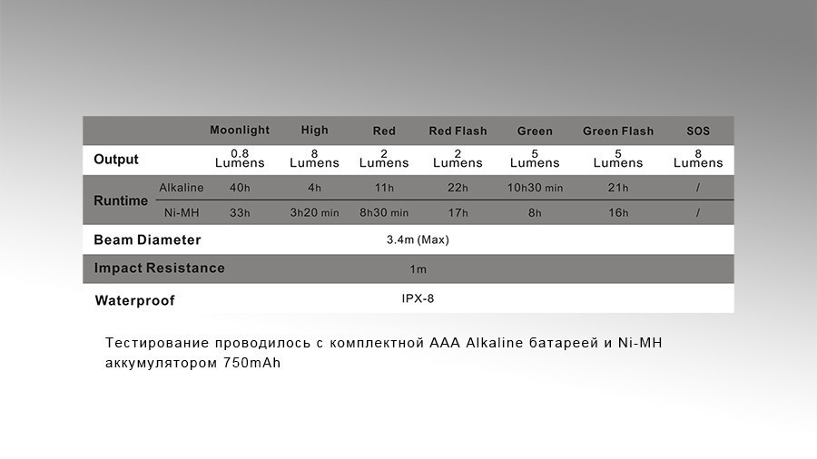 - Red: свет яркостью 2 люмена, на alkaline батарейке — 11 ч работы, на Ni-MH аккумуляторе — 8 ч 30 мин работы;