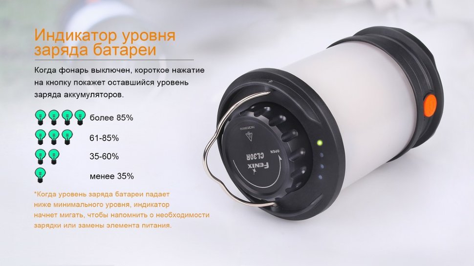 Fenix CL30R в состоянии заряжаться при помощи кабеля с micro-USB разъемом (при условии использования адаптера), а также сам служить источником питания для зарядки других приборов. В Этом фонаре встроен индикатор, который помогает отслеживать уровень оставшегося заряда. На процент заряда указывают зажигающиеся лампочки (от одной, до четырех).