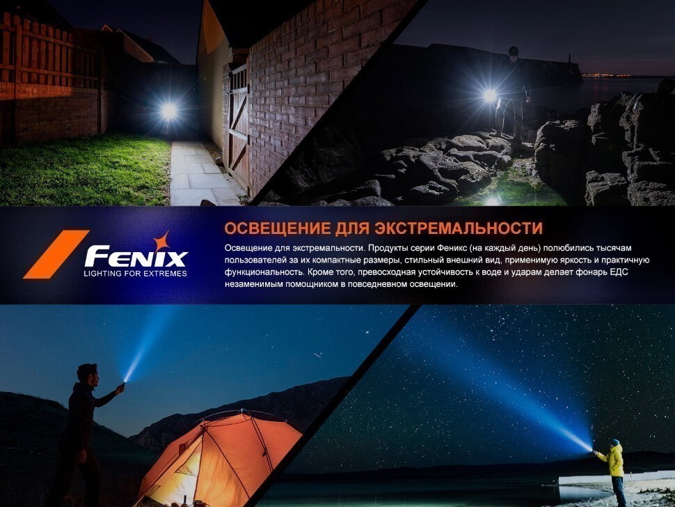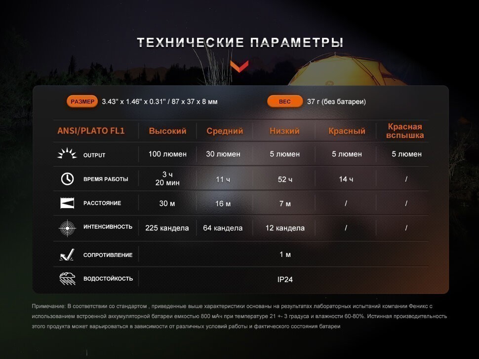 Примечание: в соответствии со стандартами ANSI/PLATO FL1, указанные выше параметры работы фонаря основаны на результатах, полученных фирмой Fenix в ходе лабораторных опытов. Испытания провели с применением встроенного 800mah аккумулятора при температуре 21±3°C и влажности 50%-80%. Реальные показатели этого продукта могут отличаться в зависимости от различных условий окружающей среды и задействованнного аккумулятора.