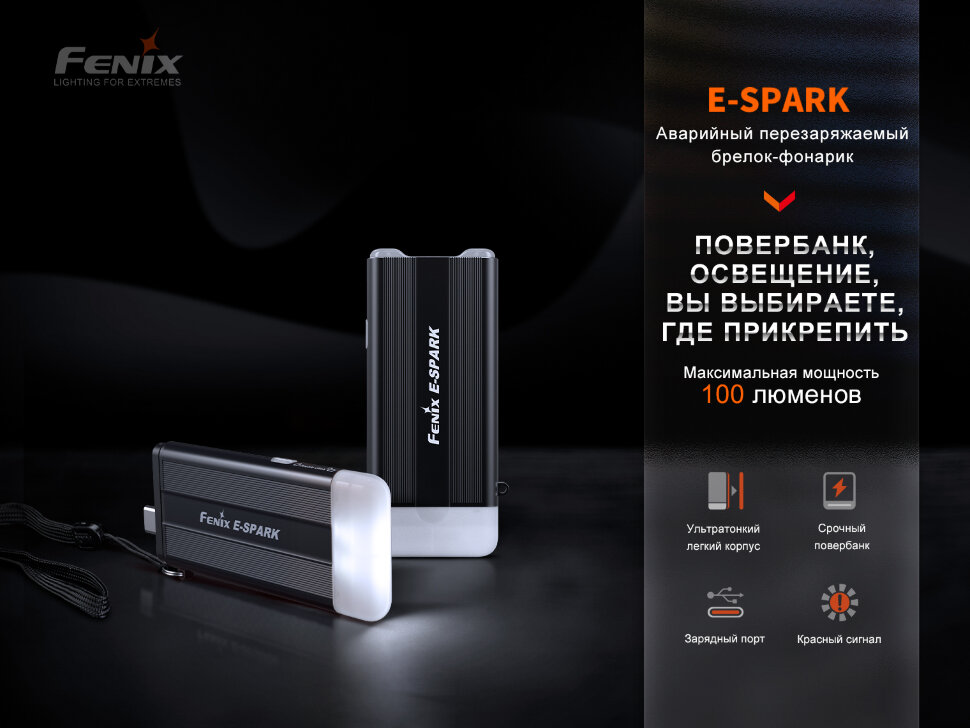 Модель Fenix E-Spark является аккумуляторным фонарём для чрезвычайных случаев. Fenix E-SPARK — перезаряжаемый прибор на брелке с возможностью Power Bank. За счёт встроенного аккумулятора ёмкостью 800 мАч он даёт наибольший световой поток 100 люменов, дальнобойность луча достигает 30 метров.
