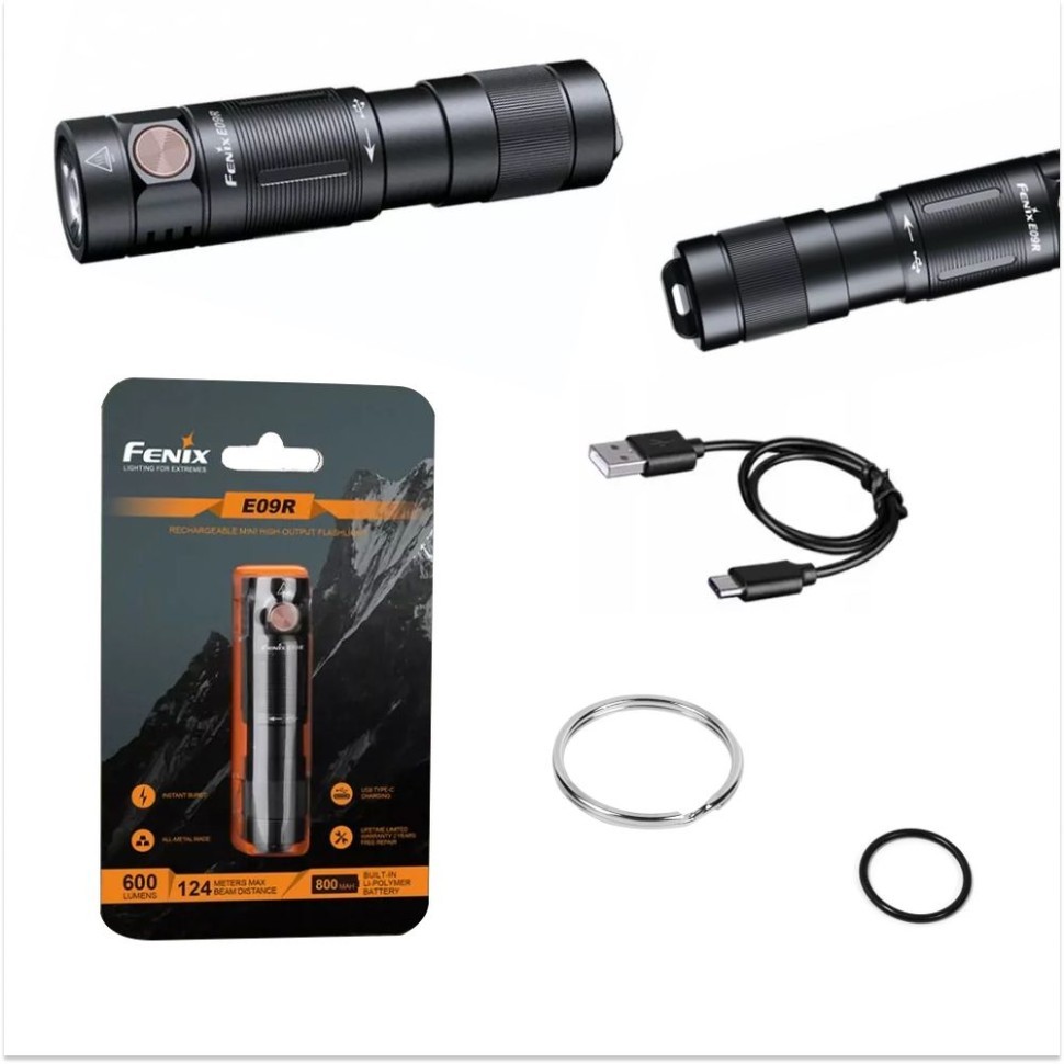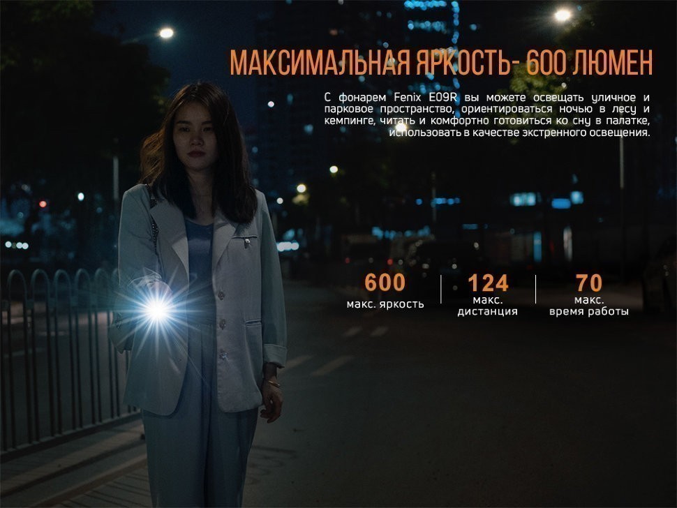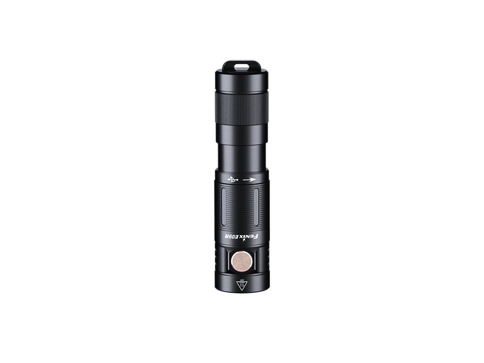 Фонарь Fenix E09R представляет собой компактный по размерам и лёгкий брелок, который даёт максимальный световой поток до 600 люменов. При этом дальность действия луча составляет 124 метра. Работает модель на светодиоде Luminus SST20, а элементом питания служит встроенный Li-Po аккумулятор 800 мАч. Срок эксплуатации светодиода достигает 50 тысяч часов.
