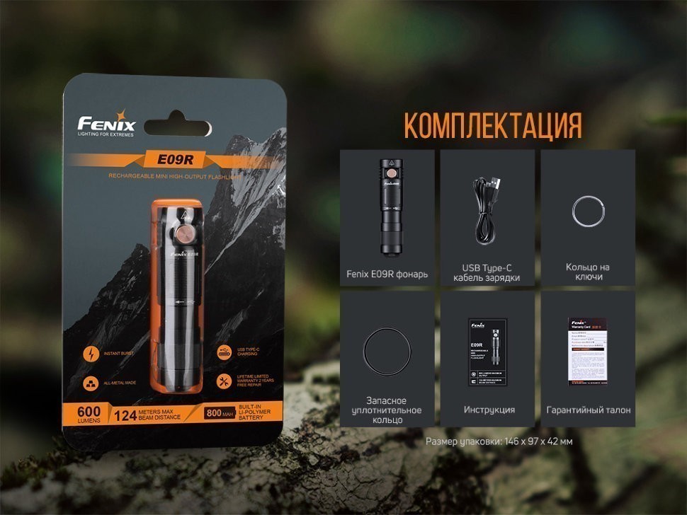 Комплектация: модель фонаря Fenix E09R, кабель для зарядки USB Type-C, кольцо на ключи, запасное уплотнительное кольцо, руководство пользователя, талон гарантии.