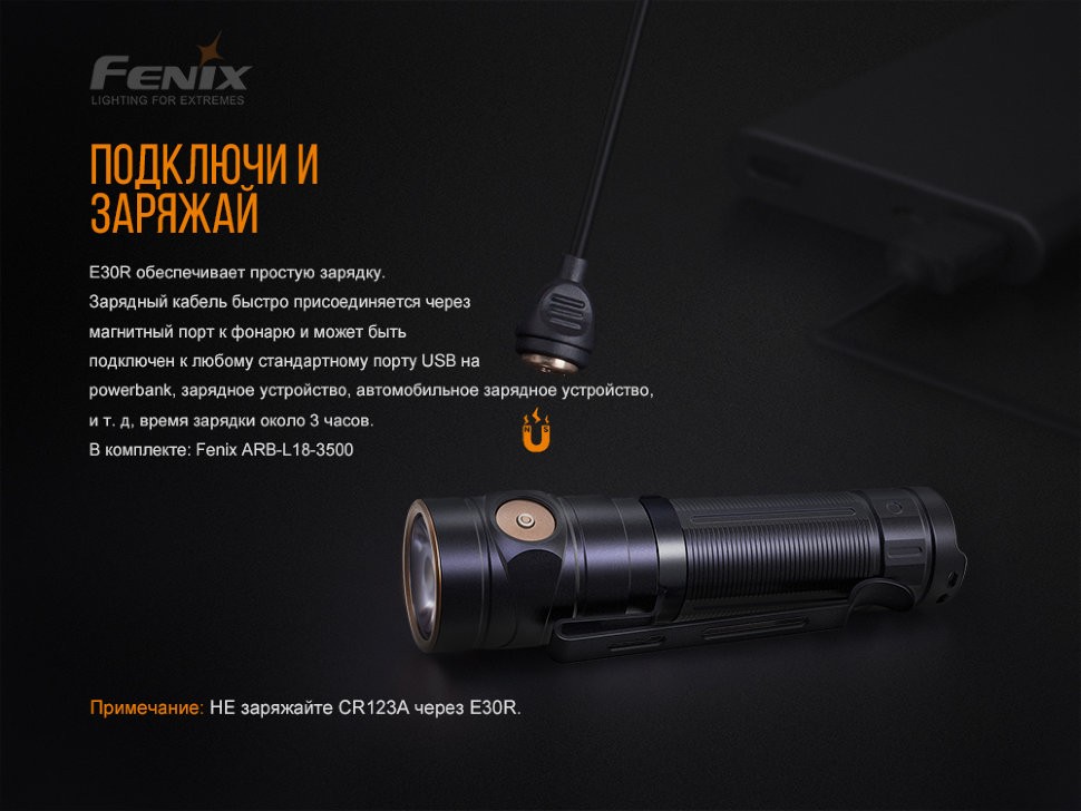 Комплектация: Фонарь Fenix E30R, аккумулятор ARB-L18 3500 фирменного производства, клипса, магнитный кабель USB для зарядки, ремешок на запястье, дополнительное уплотнительное кольцо, гарантия и инструкция.