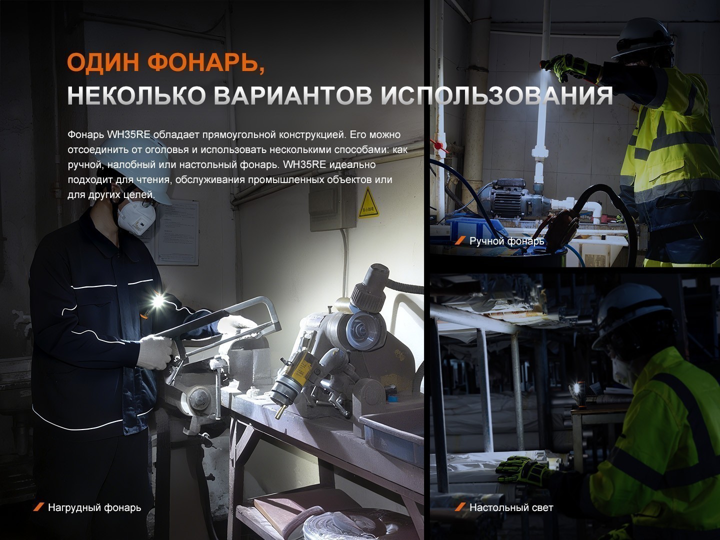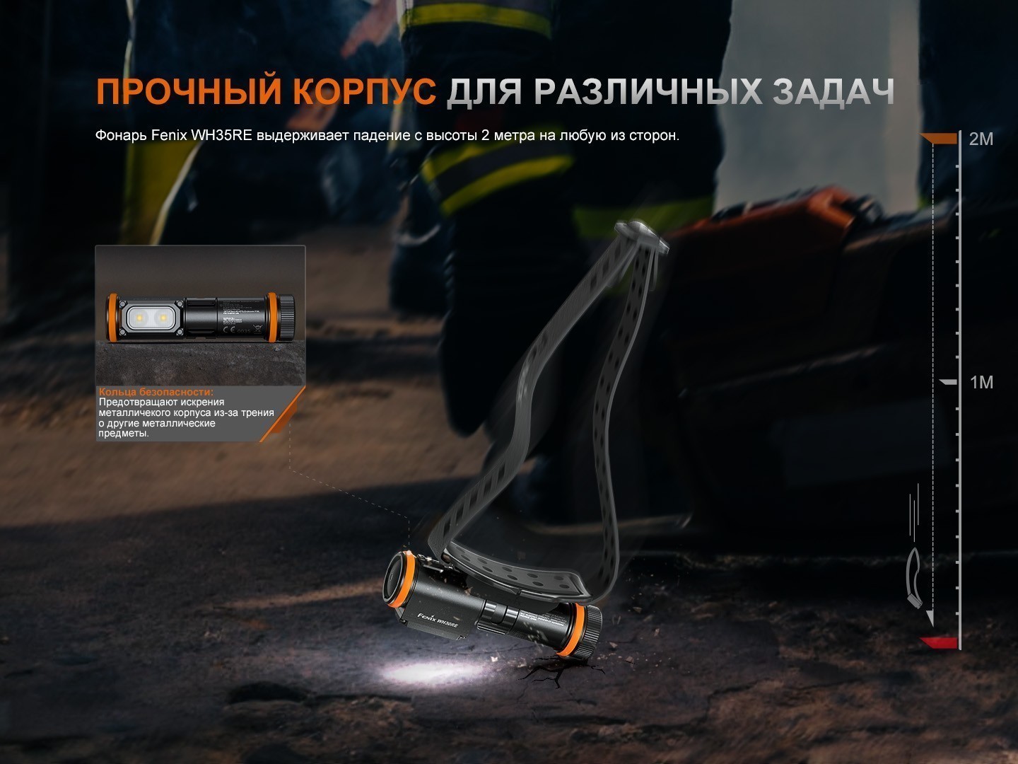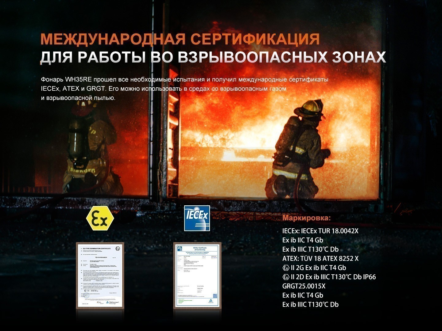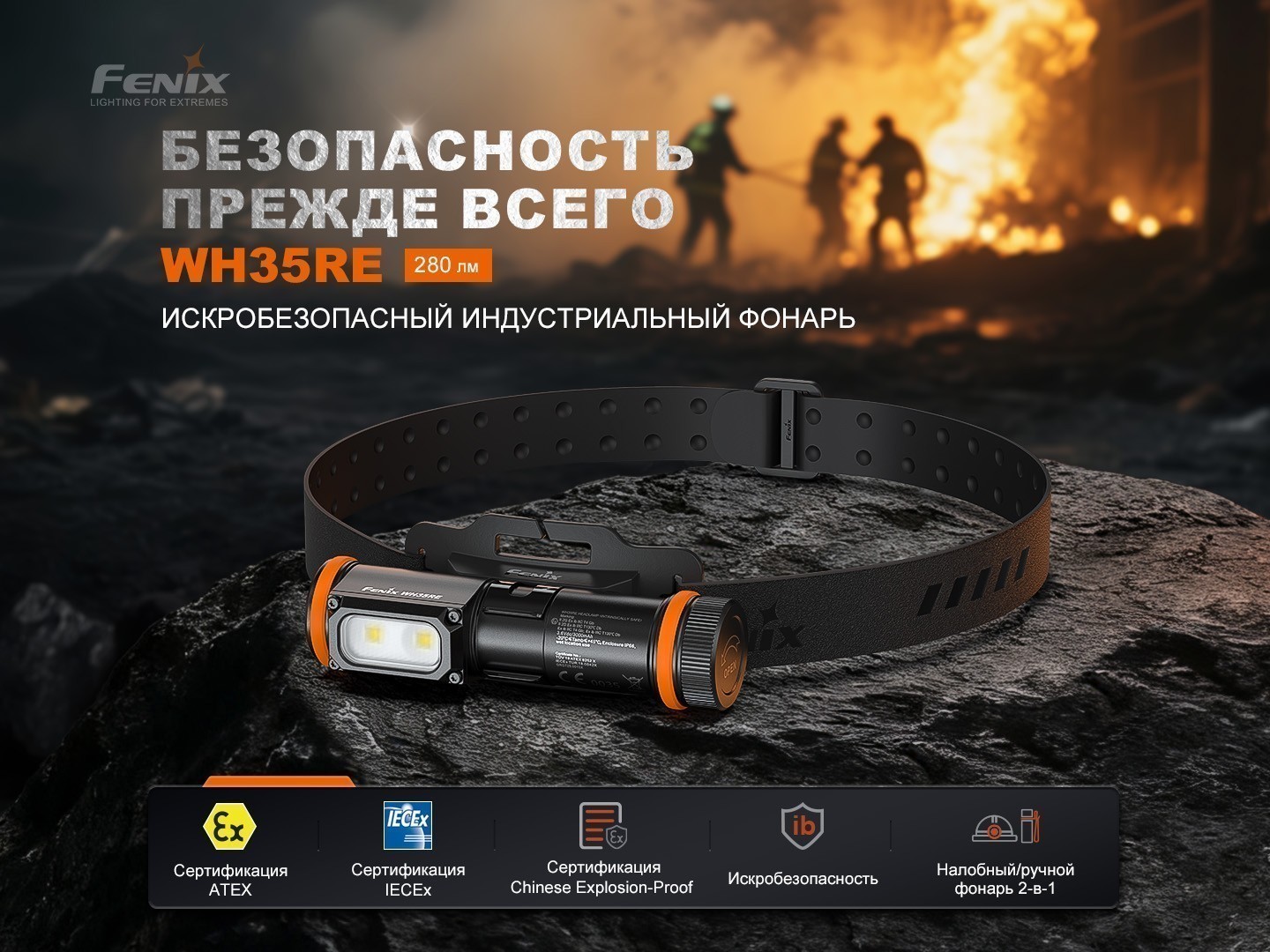 Fenix WH35RE — это профессиональный индустриальный налобный фонарь, разработанный специально для использования во взрывоопасных средах. Он безопасен для эксплуатации в газовых и пылевых зонах (1, 2, 21 и 22) и подходит для работы в нефтяной, химической, текстильной промышленности, при пожаротушении, на металлургических заводах, электростанциях и целлюлозно-бумажных фабриках. Модель имеет международные сертификаты IECEx, ATEX и GRGT, подтверждающие ее соответствие строгим требованиям безопасности.