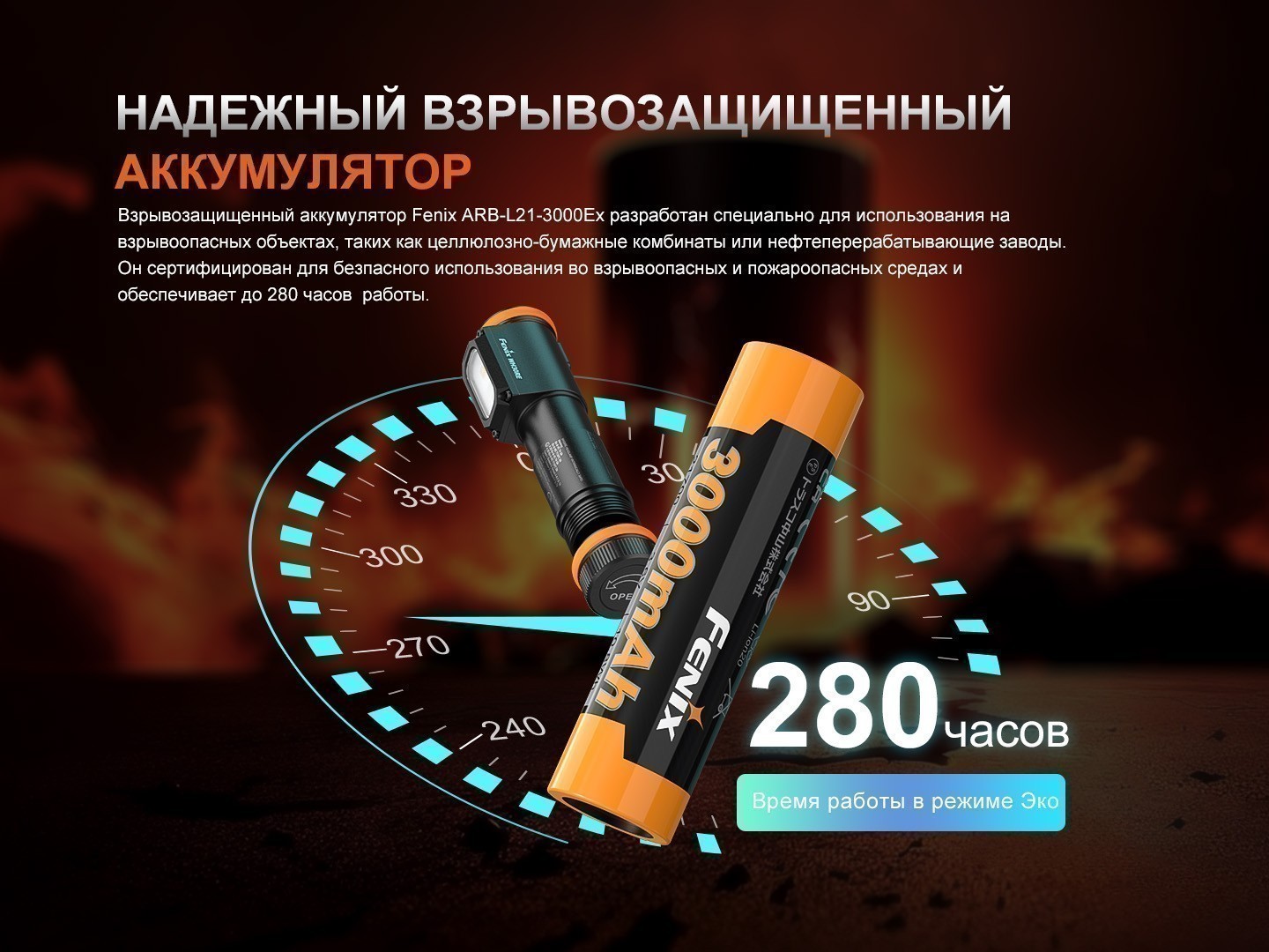 - аккумулятор — взрывозащищенный аккумулятор Fenix ARB-L21-3000Ex (формат 21700) емкостью 3000 мАч;