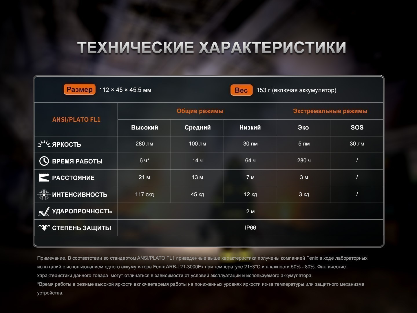 | Элементы питания | взрывозащищенный аккумулятор Fenix ARB-L21-3000Ex (21700) | |||||