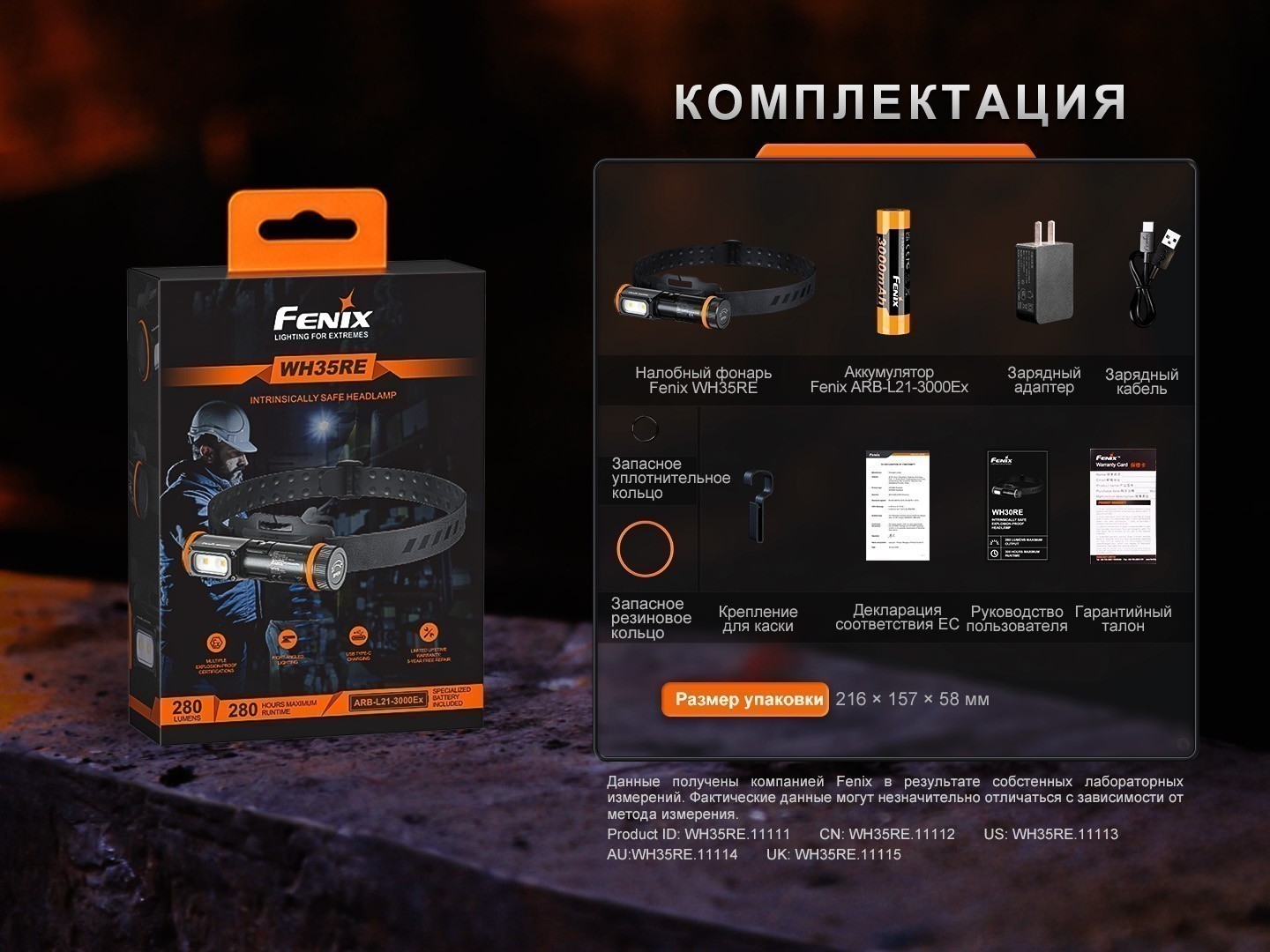 - комплектация — налобный фонарь Fenix WH35RE, аккумулятор ARB-L21-3000Ex, зарядный адаптер, зарядный кабель, запасное уплотнительное кольцо, запасное резиновое кольцо, крепление для каски, декларация соответствия ЕС, руководство пользователя, гарантийный талон;