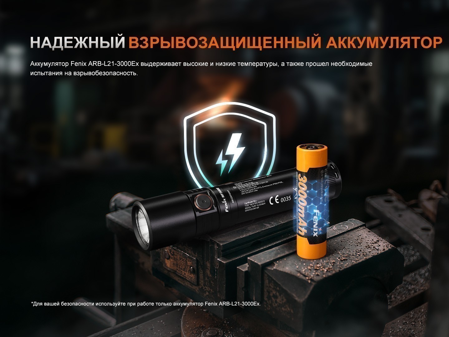 - аккумулятор — взрывозащищенный аккумулятор Fenix ARB-L21-3000Ex (формат 21700) емкостью 3000 мАч;