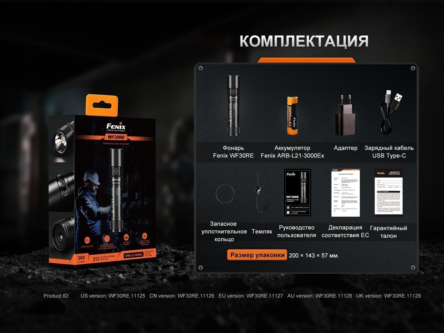 - комплектация — фонарь Fenix WF30RE 2025, аккумулятор ARB-L21-3000Ex, зарядный адаптер, зарядный кабель Type-C, запасное уплотнительное кольцо, темляк, декларация соответствия ЕС, руководство пользователя, гарантийный талон;
