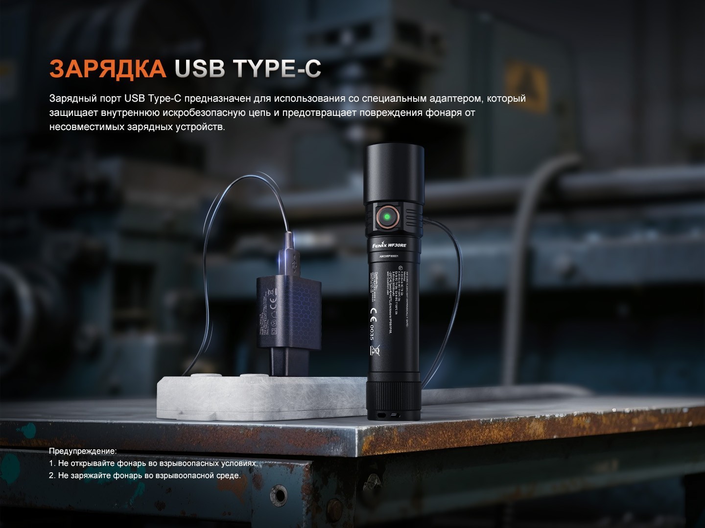 Питание обеспечивается взрывозащищенным аккумулятором Fenix ARB-L21-3000Ex формата 21700 емкостью 3000 мА·ч. Зарядка производится через порт USB Type-C с безопасным адаптером, входящим в комплект. Максимальное время работы фонаря в экономичном режиме составляет более 13 дней, что делает его надежным источником света при аварийных ситуациях.