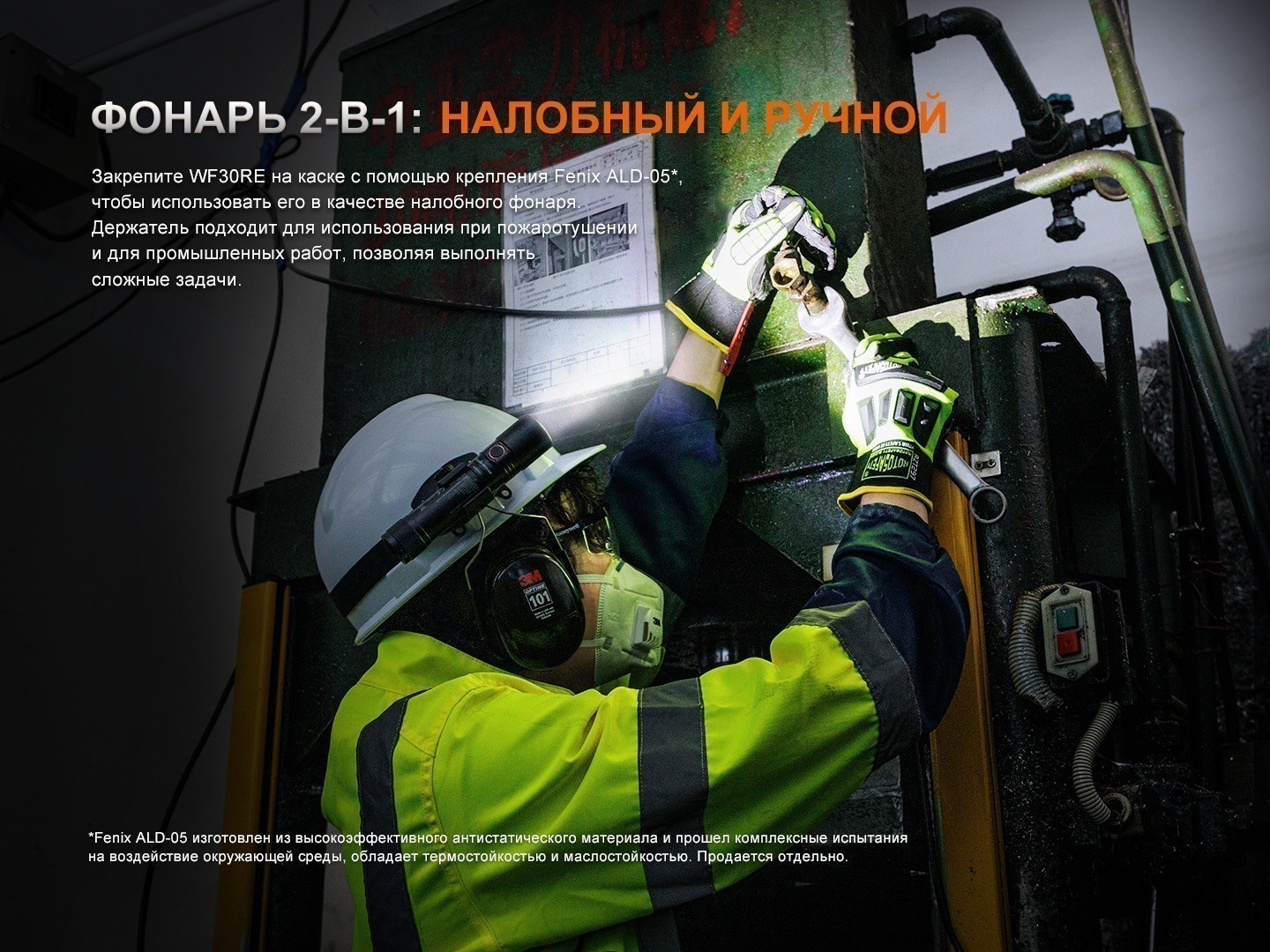 Фонарь может использоваться с жаропрочным оголовьем ALD-05, благодаря которому его можно надеть на каску и использовать как налобный. Оголовье ALD-05 необходимо приобретать отдельно.