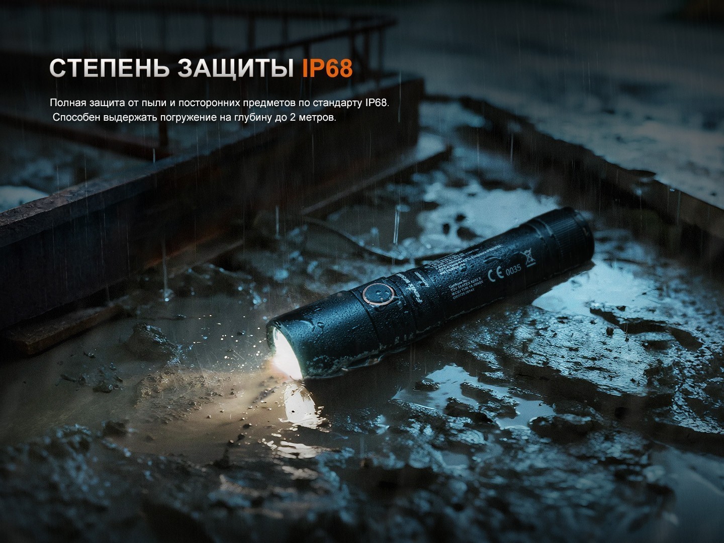 Корпус выполнен из прочного алюминиевого сплава A6061-T6, устойчивого к коррозии и механическим повреждениям. Фонарь имеет степень защиты IP68, что означает полную пыленепроницаемость и возможность погружения под воду на глубину до 2 метров. Ударопрочность до 1 метра гарантирует сохранность фонаря при падении или вибрации во время работы.