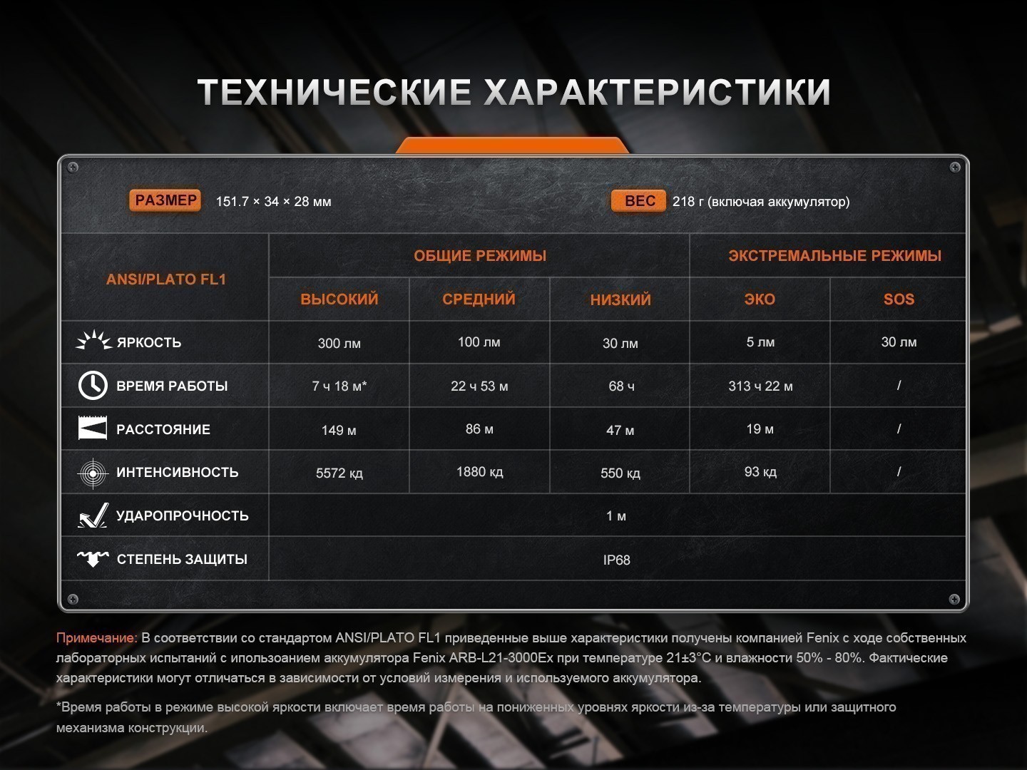 | Элементы питания | взрывозащищенный аккумулятор Fenix ARB-L21-3000Ex (21700) | |||||