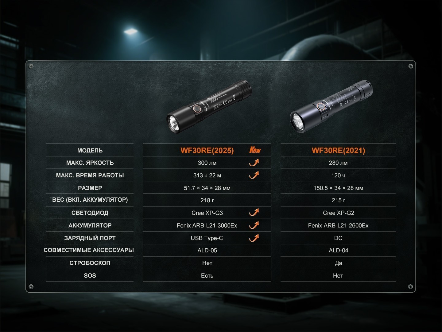 | Фонарь Fenix индустриальный WF30RE 2025, 300 люмен | ||||||