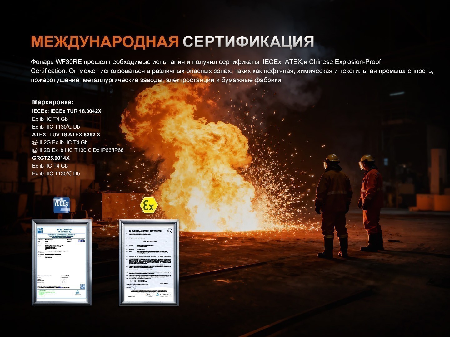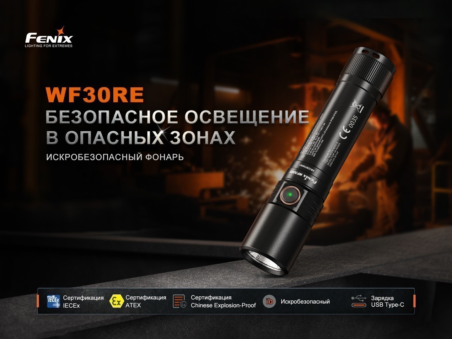Fenix WF30RE 2025 — это промышленный искробезопасный фонарь, разработанный специально для работы во взрывоопасных и экстремальных условиях. Он может использоваться в нефтяной, газовой, химической и текстильной промышленности, при пожаротушении, а также на металлургических заводах, электростанциях и целлюлозно-бумажных фабриках. Благодаря международным сертификатам безопасности IECEx, ATEX и GRGT, фонарь гарантирует надежную и безопасную эксплуатацию в зонах повышенного риска, включая зоны 1 и 2 (среды с наличием взрывоопасных газовых смесей классов IIA, IIB и IIC) и зоны 21 и 22 (среды со взрывоопасной пылью).