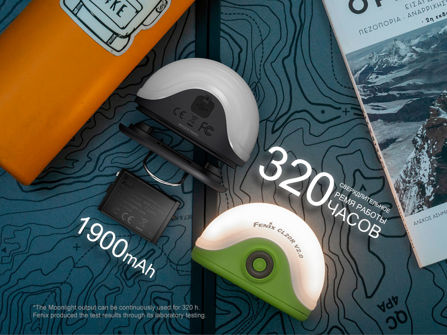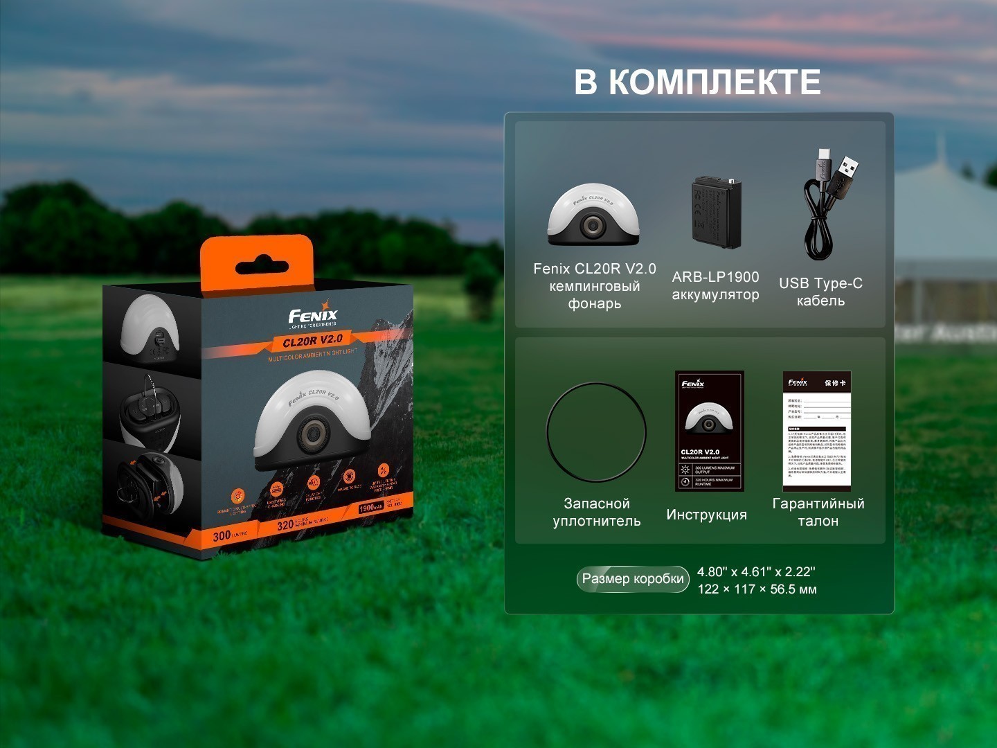 Комплектация: кемпинговый фонарь Fenix CL20R V2.0, аккумулятор ARB‑LP1900, кабель USB Type-C, запасное уплотнительное кольцо, руководство пользователя, гарантийный талон;