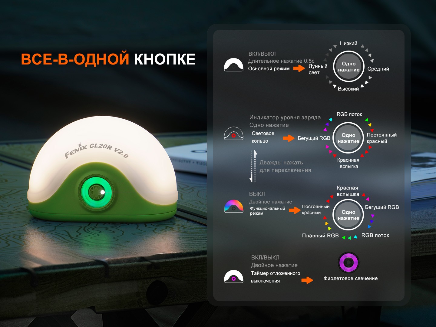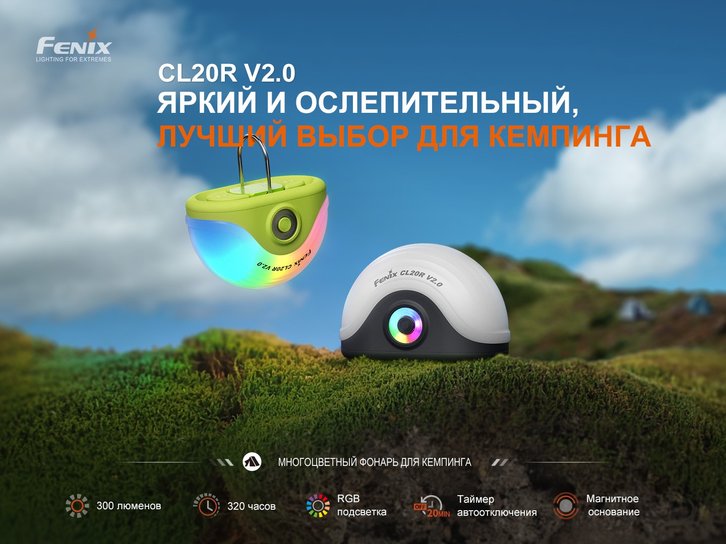 Лёгкий и компактный кемпинговый фонарь Fenix CL20R V2.0 создан для туристических походов, рыбалки, кемпинга, пикников, экспедиций и выездов на природу. Он обеспечивает удобное и надёжное освещение в палатке, на стоянке или в автомобиле, а благодаря дополнительным режимам может использоваться как ночник.