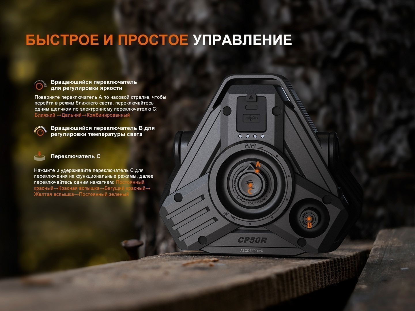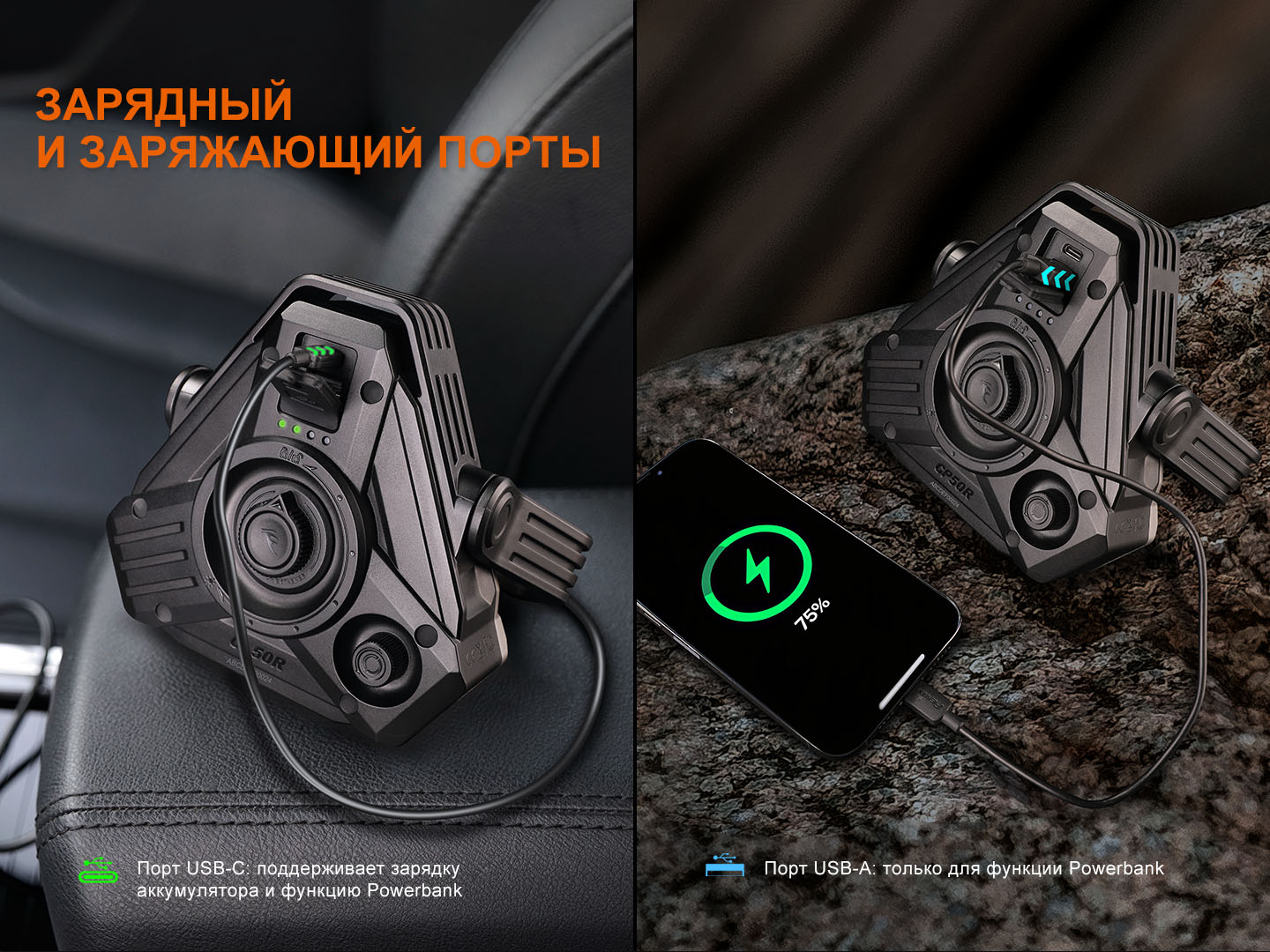 Есть быстрый USB-C вход для зарядки и мощная функция Powerbank, позволяющая использовать CP50R как фонарь с функцией зарядки телефона. Порты USB-A и USB-C позволяют питать смартфоны, рации, навигаторы и другие устройства.