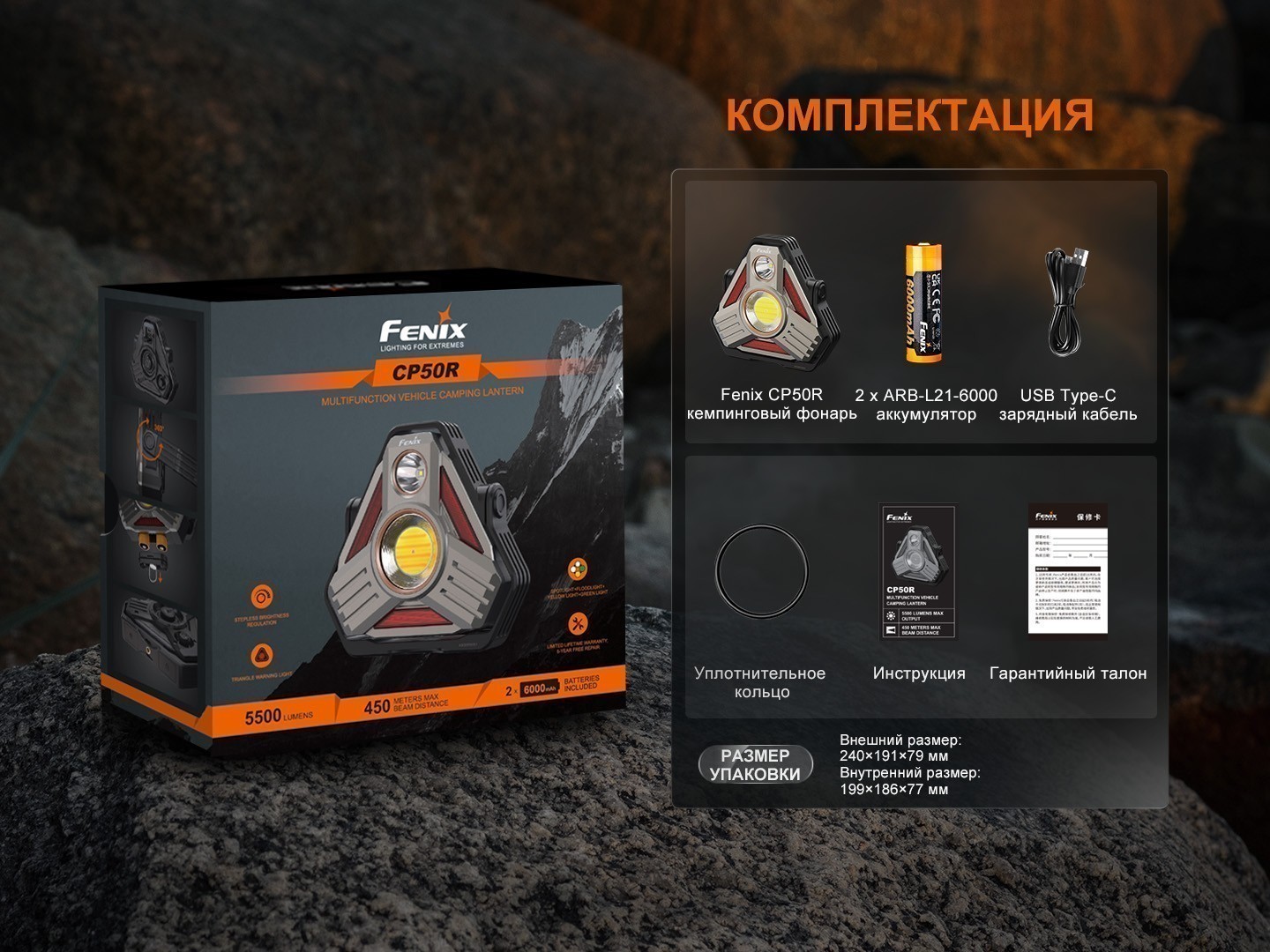 | Комплектация | Фонарь Fenix CP50R, аккумулятор Fenix ARB-L21-6000, кабель Type-C, запасное уплотнительное кольцо, руководство пользователя, гарантийный талон | ||||||||||||