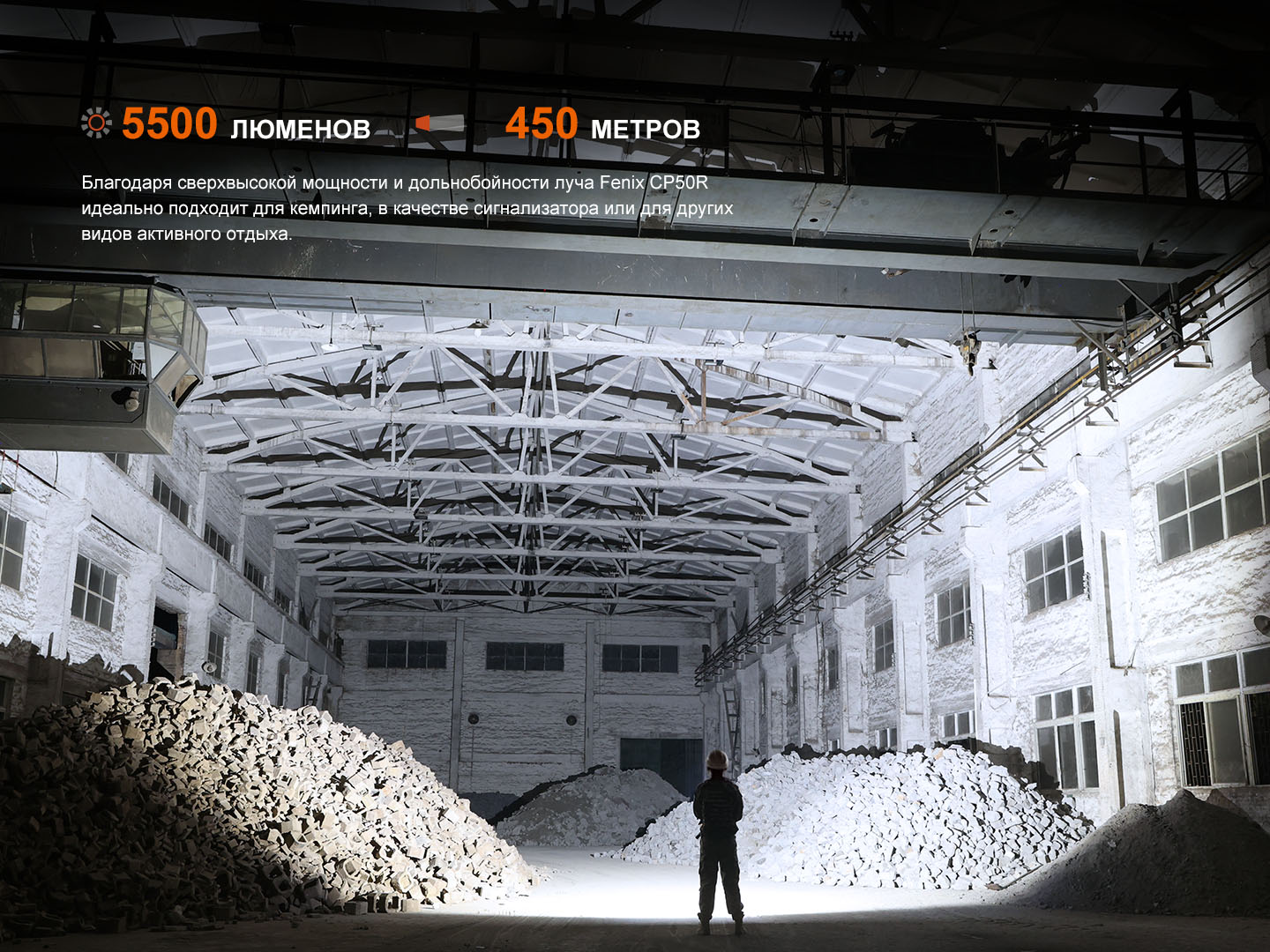 Фонарь Fenix CP50R - это самый яркий кемпинговый фонарь, выдающий до 5500 люмен и освещающий пространство на дистанции до 450 метров. Такая мощность делает его эффективным в аварийных ситуациях, на строительных площадках и в условиях, где требуется предельно высокая яркость.