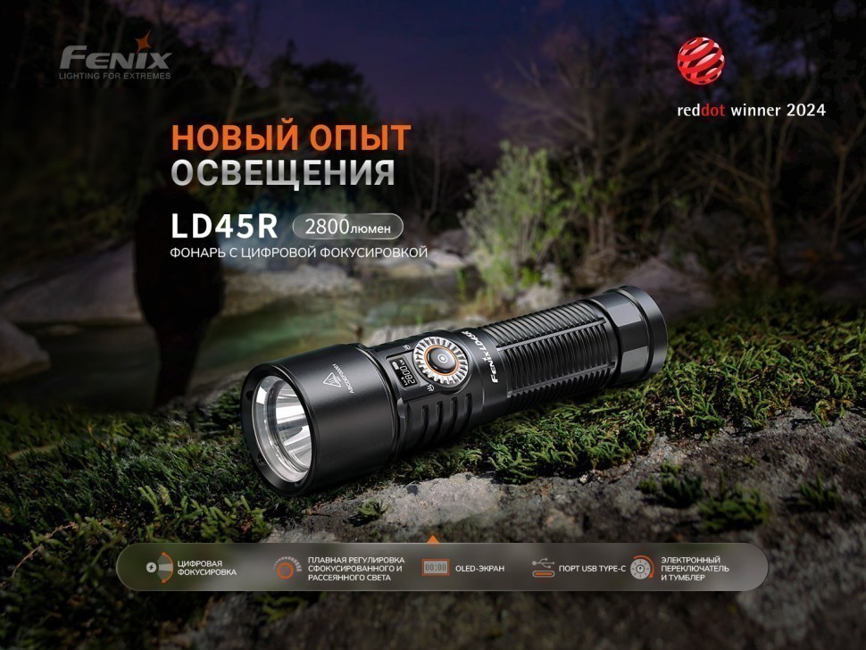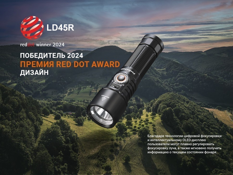 Благодаря технологии цифровой фокусировки и OLED-экрану фонарь получил максимально функциональный и эргономичный дизайн, который позволяет управлять освещением одной рукой. Fenix LD45R является победителем 2024 года премии Red Dot Design Award, вручаемой за особые достижения в дизайне потребительских товаров.