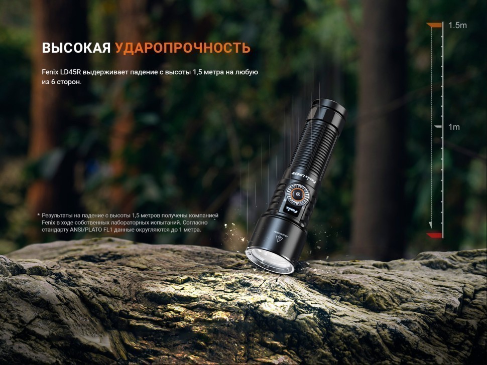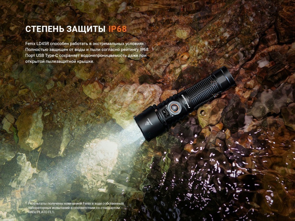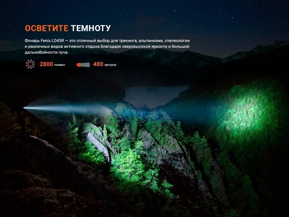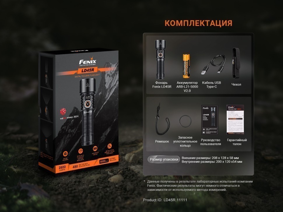 - комплектация — фонарь Fenix LD45R, аккумулятор ARB-L21-5000, кабель USB Type-C, чехол, ремешок, запасное уплотнительное кольцо, руководство пользователя, гарантийный талон;
