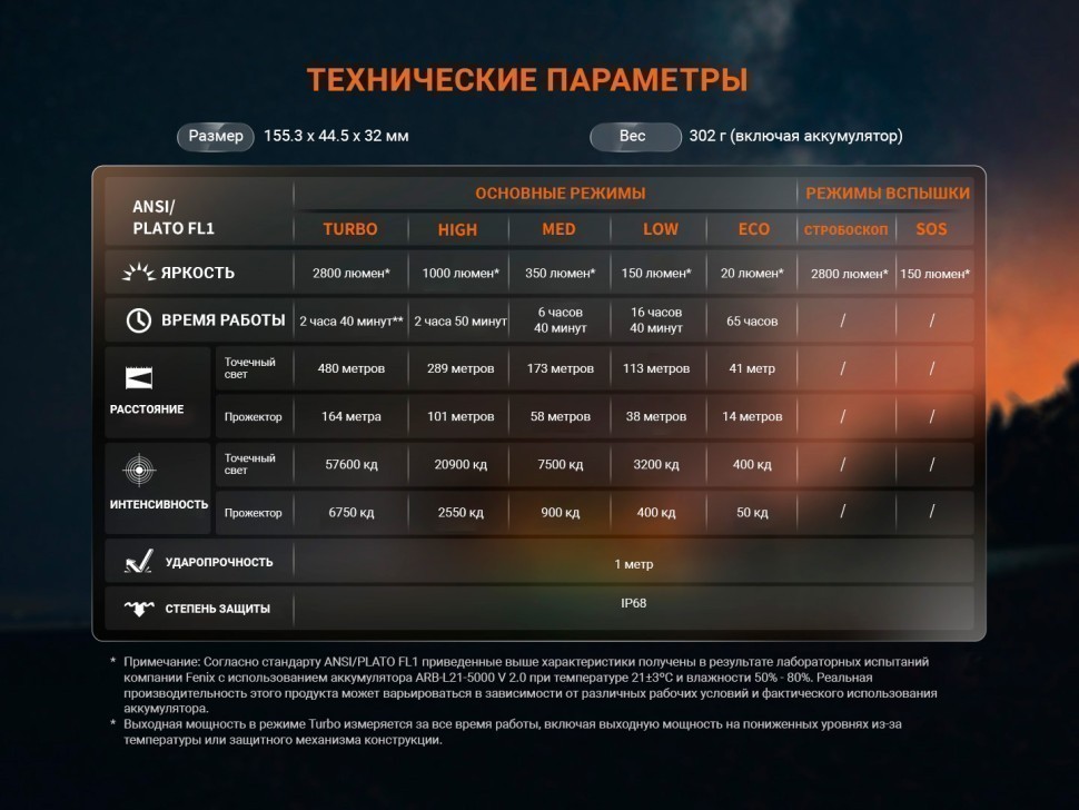 - прожектор — 2800 люмен — 6750 кандел — 2 часа 40 минут — 164 метра;