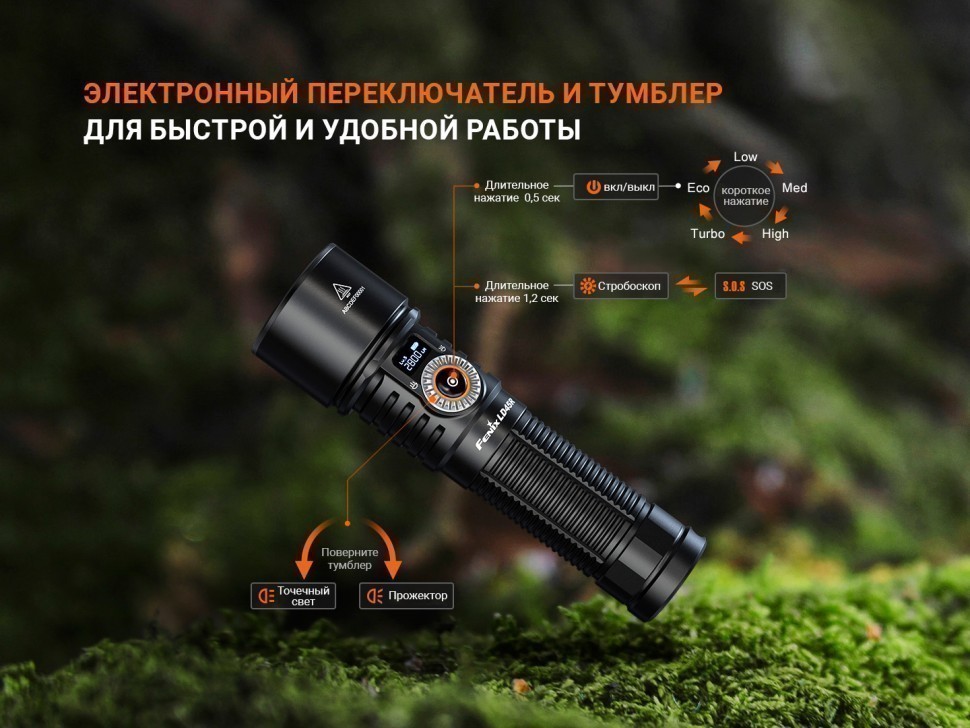 Для управления освещением в фонаре предусмотрены электронный выключатель и тумблер с поворотом на 270°. С помощью электронной кнопки пользователь может выбирать один из 7 режимов освещения. Тумблер настраивает фокусировку луча, позволяя плавно менять освещение с рассеянного (прожектор) на точечное.