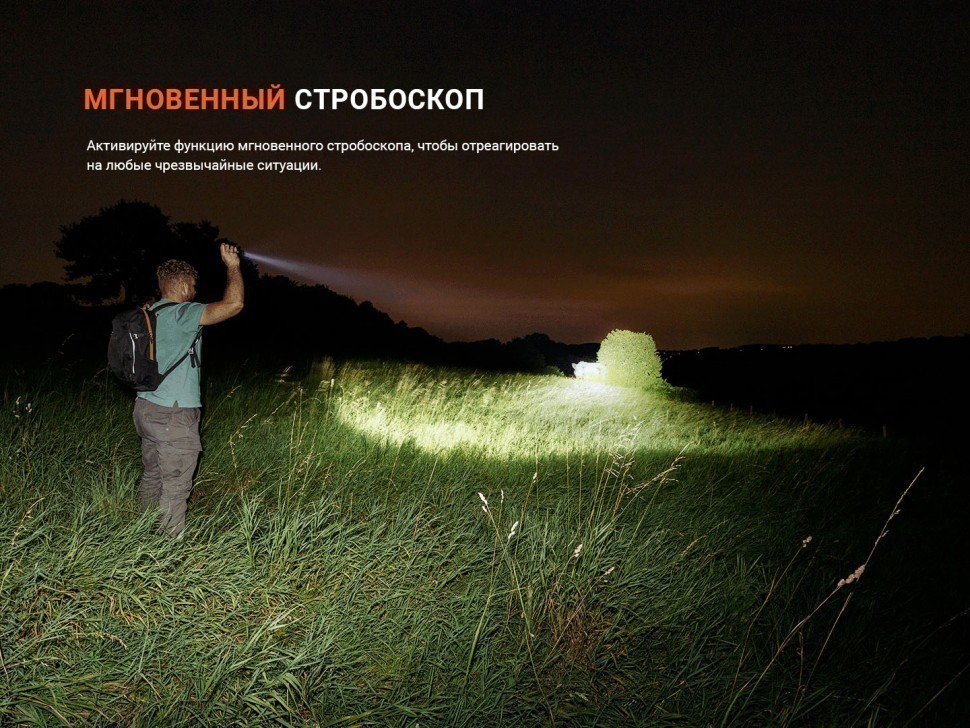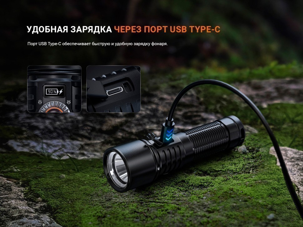 Над тумблером на корпусе фонаря расположен OLED-экран. На нем отображается вся необходимая информация — яркость, уровень заряда аккумулятора и выбранный режим работы. В комплект поставки входит аккумулятор ARB-L21-5000 емкостью 5000 мАч, который обеспечивает максимальное время работы до 65 часов. Порт USB Type-C обеспечивает быструю и удобную зарядку фонаря.