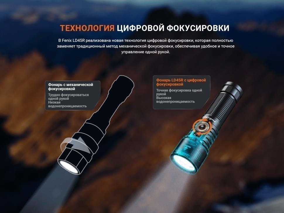Походный аккумуляторный фонарь LD45R использует новую технологию цифровой фокусировки, которая помогает регулировать луч света одной рукой. Помимо удобного управления такая функция обеспечивает более высокую водонепроницаемость корпуса, чем технология механической фокусировки.