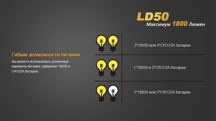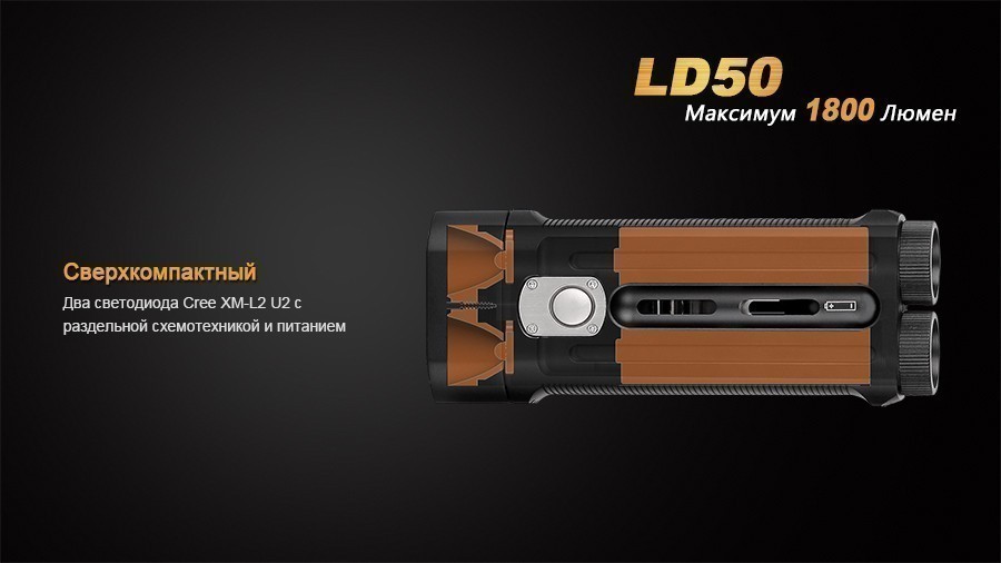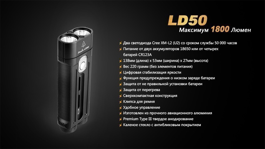 Компания Феникс предлагает усовершенствованную модель универсального фонаря. Это Fenix LD50 XM-L2 (U2). Своей универсальностью он обязан грамотному сочетанию самых важных для осветительного прибора технических характеристик. Для высокой надежности работы, фонарь оснастили двумя независимыми светодиодами Cree XM-L2 (U2). Даже если один из них выйдет из строя, второй продолжит работать. Купить запасные аккумуляторы для этой модели не составит труда, поскольку фонарь работает на батареях популярного формата 18650 или же CR123A .