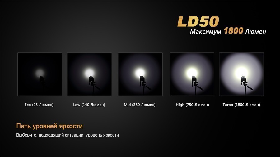 Дальность светового потока Fenix LD50 XM-L2 (U2) составляет 270 м, а мощность регулируется от 25 люмен в режиме Eco и до 1800 люмен в режимах Strobe и Turbo с тремя промежуточными ступенями яркости.