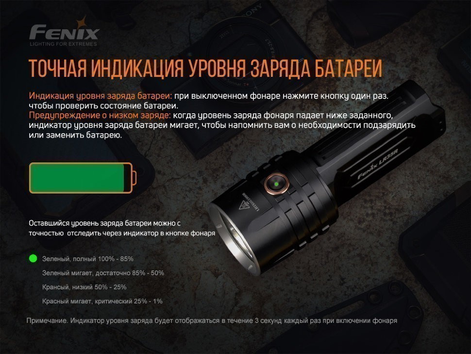 Следует подчеркнуть также, что в модели Fenix LR35R реализована функция защиты от перегревания. Изделие в процессе применения накапливает много тепла, что приводит в результате к нагреванию корпуса. Если температура поднимается выше 65 градусов Цельсия, то срабатывает опция понижения яркости. Это необходимо для охлаждения фонаря. Когда же температура упадёт до 65 градусов Цельсия, пользователь снова может выбирать «Средний», «Максимальный» или «Турбо» режим.