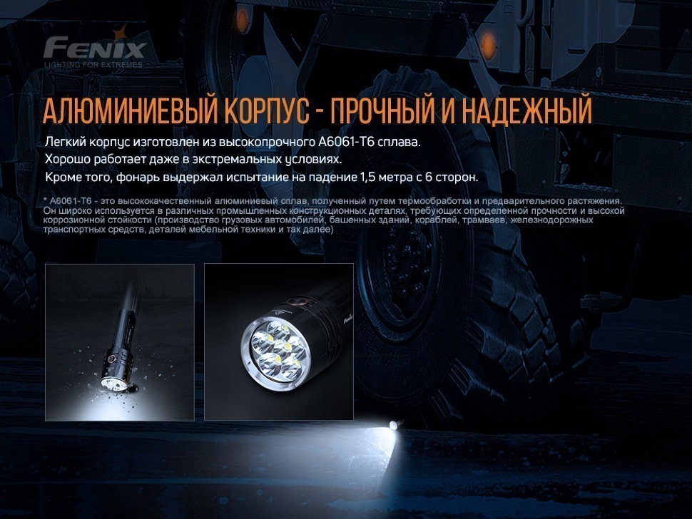 Корпус фонаря изготовлен из высокопрочного материала А6061-Т6. Алюминий в составе изделия обеспечивает фонарю такие качества, как устойчивость к механическим повреждениям, к ударам и износу. Отметим, что материал А6061-Т6 представляет собой очень добротный алюминиевый сплав, который широко используется во многих отраслях производства.