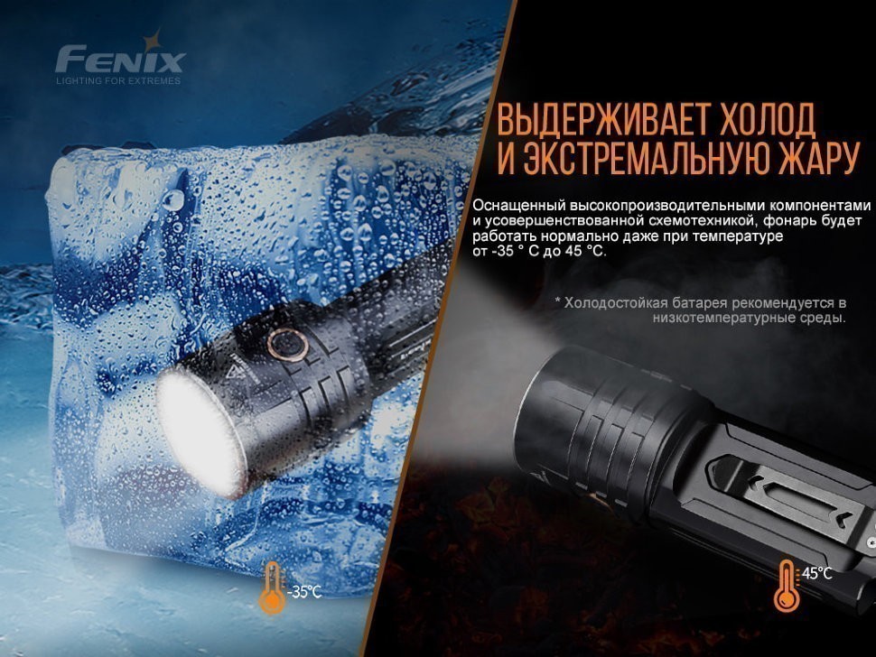 Следует подчеркнуть также, что в модели Fenix LR35R реализована функция защиты от перегревания. Изделие в процессе применения накапливает много тепла, что приводит в результате к нагреванию корпуса. Если температура поднимается выше 65 градусов Цельсия, то срабатывает опция понижения яркости. Это необходимо для охлаждения фонаря. Когда же температура упадёт до 65 градусов Цельсия, пользователь снова может выбирать «Средний», «Максимальный» или «Турбо» режим.