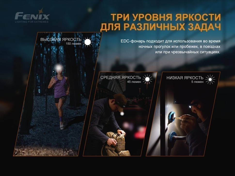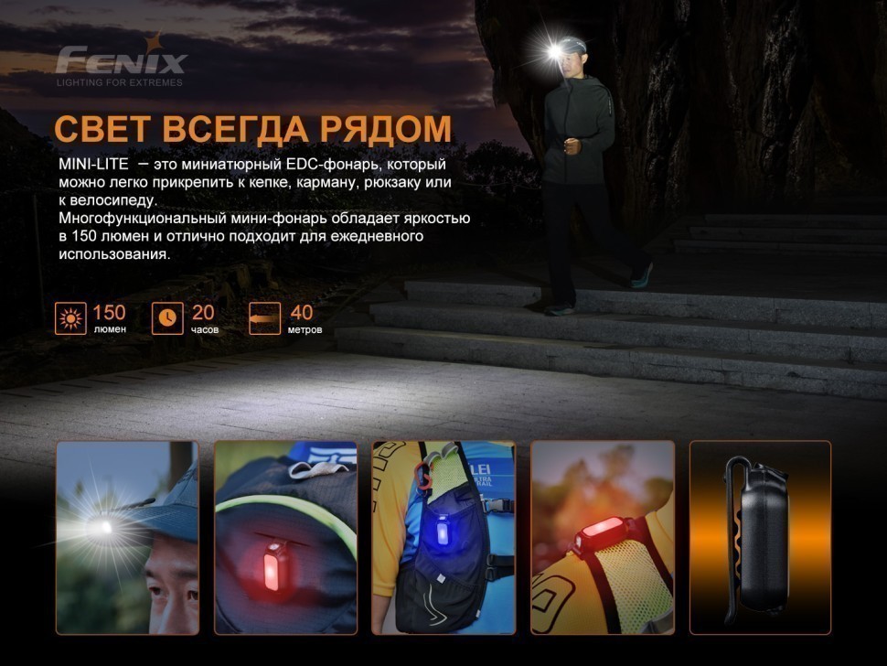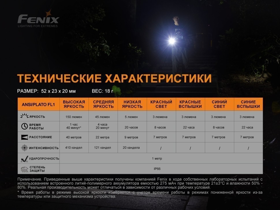 Fenix MINI-LITE обладает 2 светодиодами — MATCH CA18 с белым светом и Everlight 2835 с красным и синим освещением. Срок службы каждого элемента составляет 50 000 часов. Максимальная яркость фонаря составляет 150 люмен, дальнобойность луча достигает 40 метров. Помимо основного освещения LED-фонарь может работать как сигнальный маячок синего или красного света.