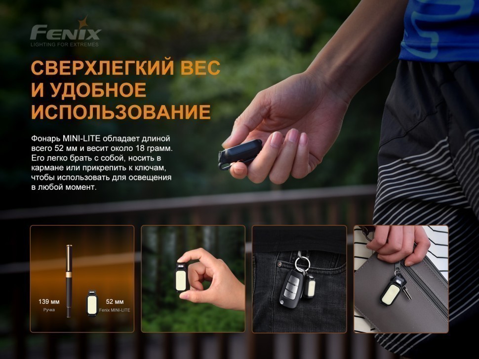 Карманный EDC-фонарь Fenix MINI-LITE легко крепится к одежде, кепке, рюкзаку, походной экипировке или даже к велосипеду в качестве велофары благодаря удобной клипсе. Он отлично подходит для ежедневного использования, походов, рыбалки, спорта и активного отдыха. Миниатюрный размер 52 мм в длину и легкий вес 18 г позволяют удобно носить его с собой и использовать как наключный фонарь. В комплекте предусмотрено кольцо, которое позволяет использовать его как брелок.
