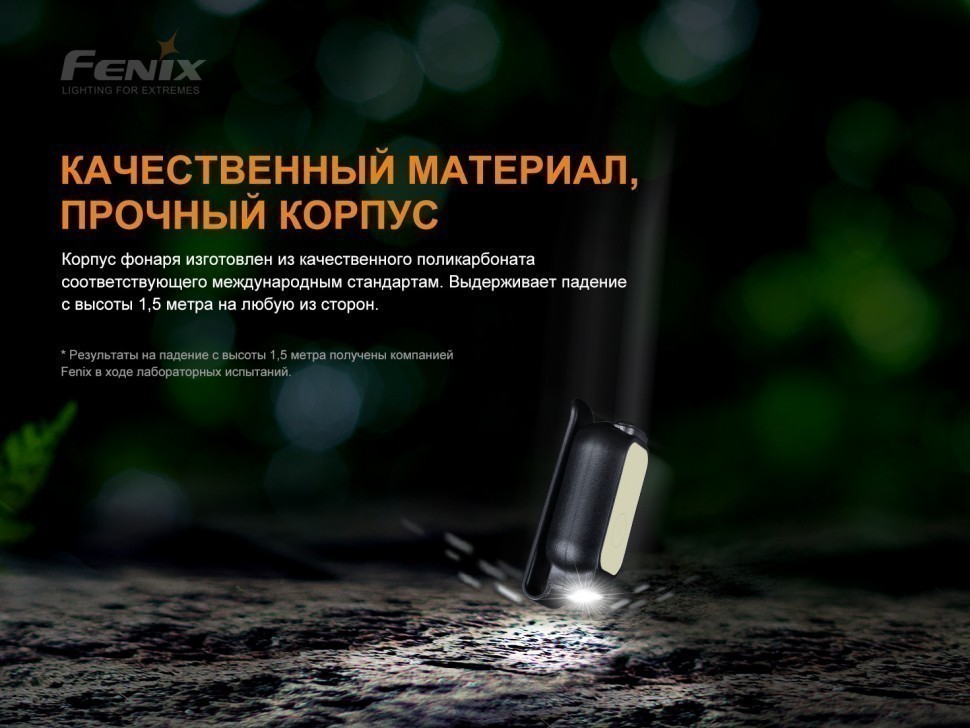Мини-фонарь отлично переносит экстремальные условия, будет работать даже в сильный дождь. Степень защиты от воды и пыли — IP66. Выполнен из легкого качественного поликарбоната, выдерживает падение с высоты 1,5 метров.